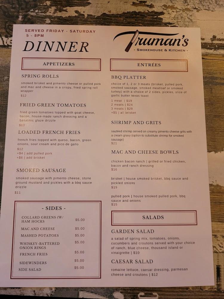 The menu at Truman's Smokehouse and Kitchen offers a wide variety of southern-inspired dishes. Breakfast items like the Garbage Bowl and pancakes are crowd-pleasers. For lunch and dinner, savor options like brisket platters, sandwiches, and hearty salads.
