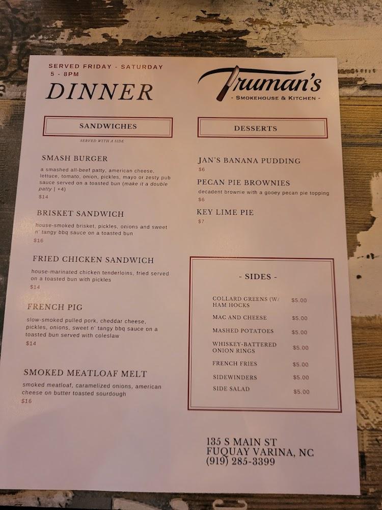 Welcome to Truman's Smokehouse and Kitchen, a vibrant culinary destination in Fuquay-Varina, NC, where community and flavor come together. Start your day with our renowned Garbage Bowl, packed with delicious ingredients, or delight in our pit-master’s hickory-smoked brisket and pulled pork later on. With a welcoming atmosphere perfect for friends and family, Truman's offers a diverse menu that satisfies every craving, along with excellent coffee, cocktails, and desserts. Enjoy your meal on our terrace or opt for takeout and delivery. Join us at 135 S Main St and experience the heart of great food and good times!